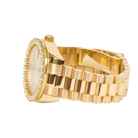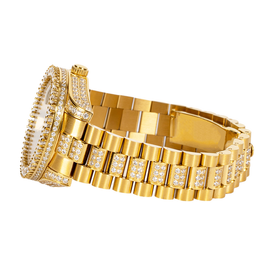 Moissanite Stainless Steel Gold Dial Mens Yellow Steel Band Watch