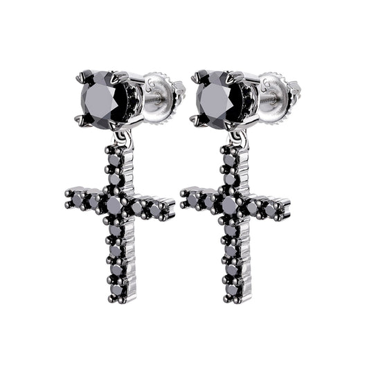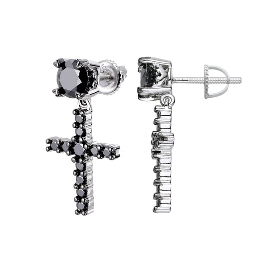 S.Silver Round Black Moissanite Cross Religious Stud Earrings BP+RP 7/8 Cttw