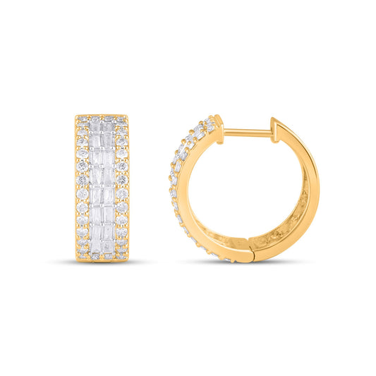 10K Yellow Gold Round Baguette Diamond 3 Row Designer Hoop Earring 1 Cttw