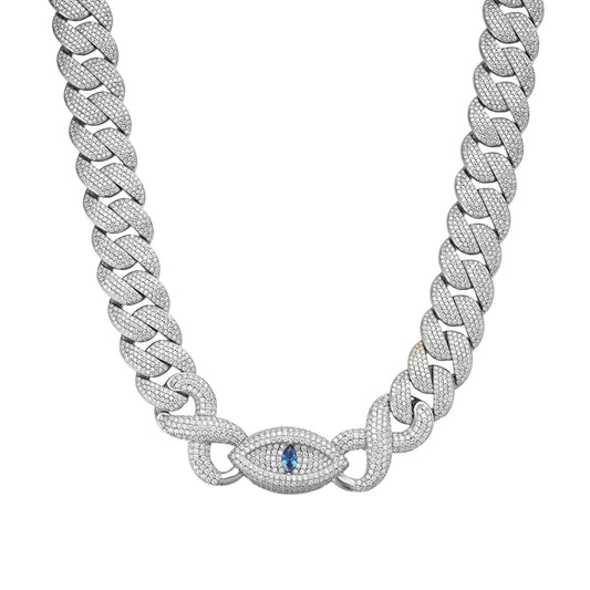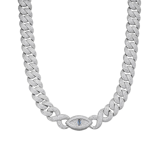 S.Silver Round Moissanite 18mm Inifinity Cuban With Evil Eye Designer 22 Inch Mens Necklace PP 35 Cttw