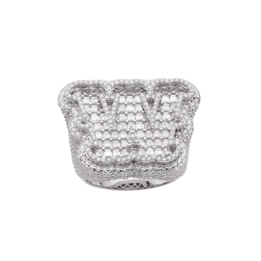 S.Silver Round Baugette Moissanite Albhabet V letter Initial SZ 10 Mens Ring RP 7-1/2 Cttw
