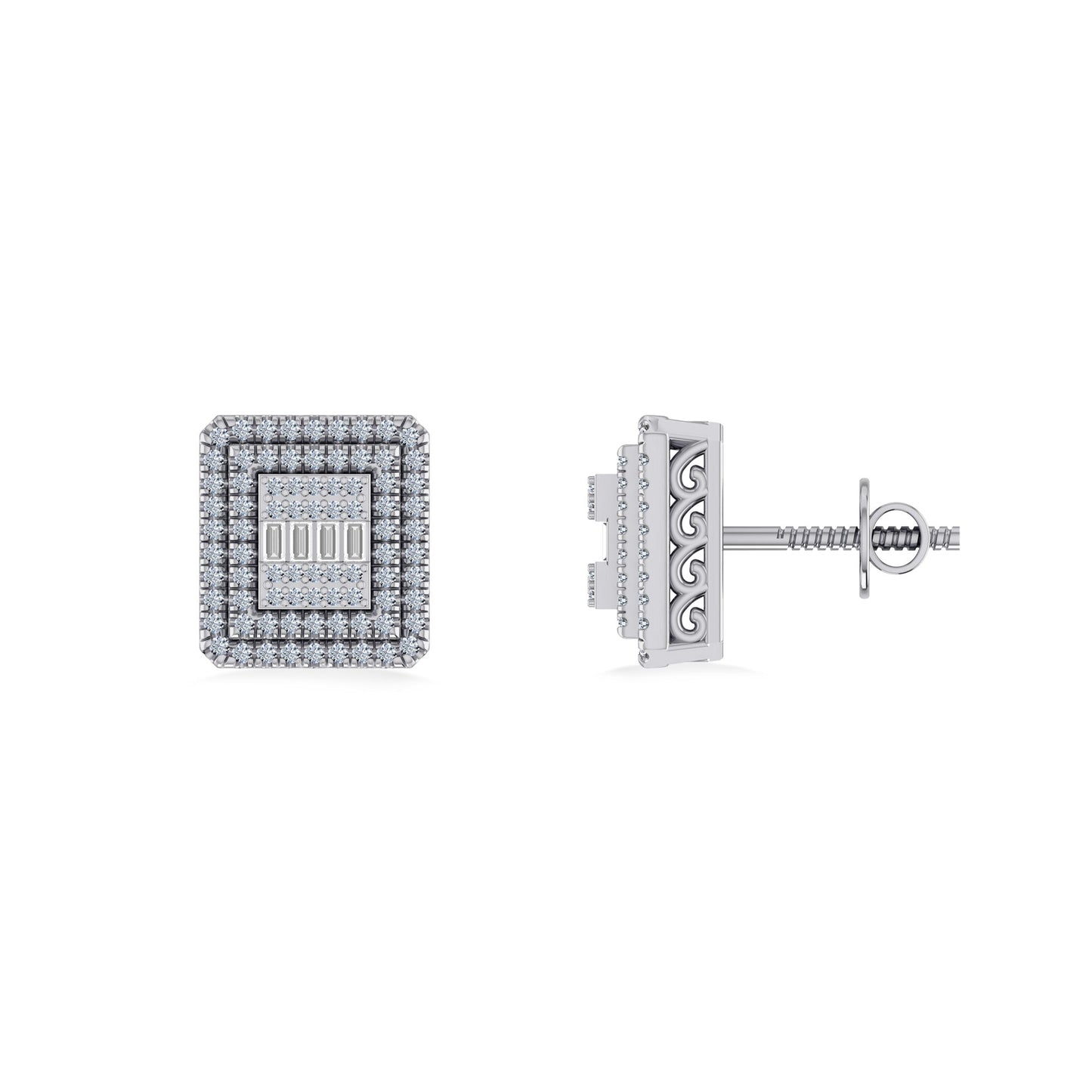 10K White Gold Round Baguette Diamond Square Shape Designer Mens Stud Earring 3/8 Cttw