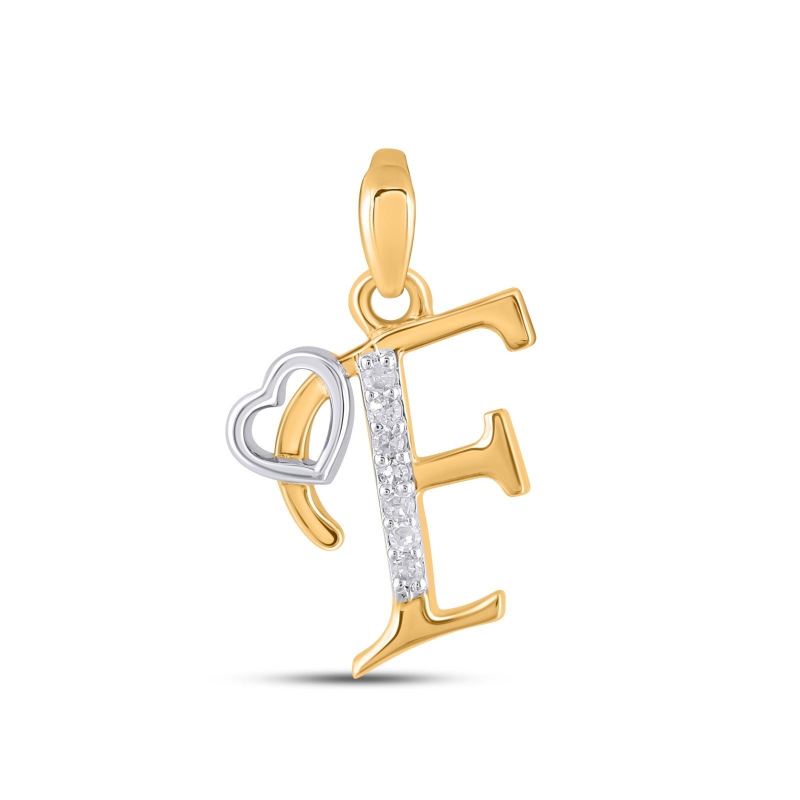 10K Yellow Gold Round Diamond F Letter Initial With Heart Pendant 1/10 Cttw