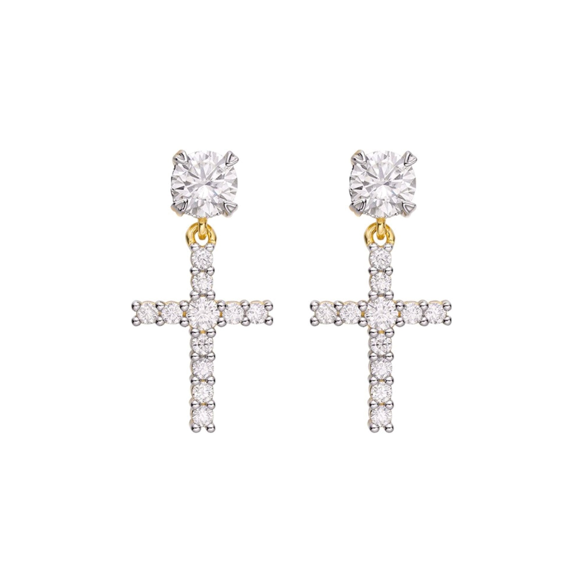 S.Silver Round Moissanite Cross Religious Stud Earrings RP+GP 7/8 Cttw
