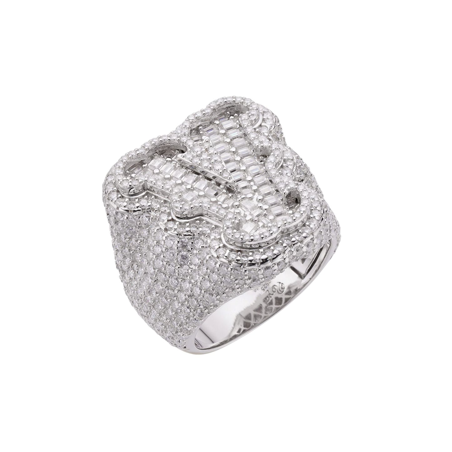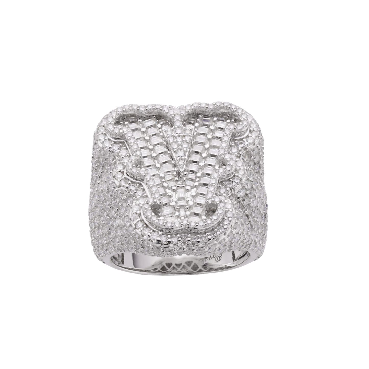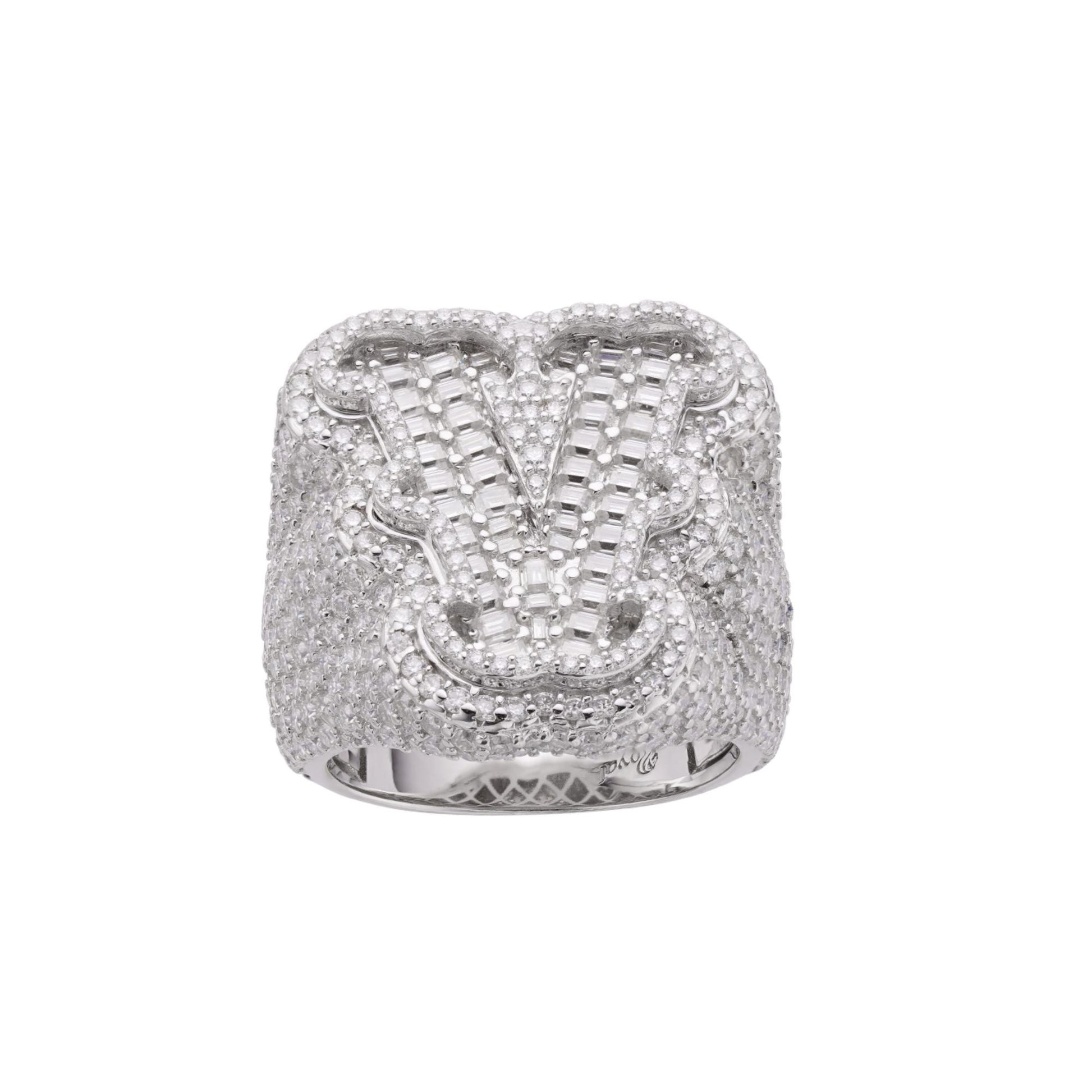 S.Silver Round Baugette Moissanite Albhabet V letter Initial SZ 10 Mens Ring RP 7-1/2 Cttw